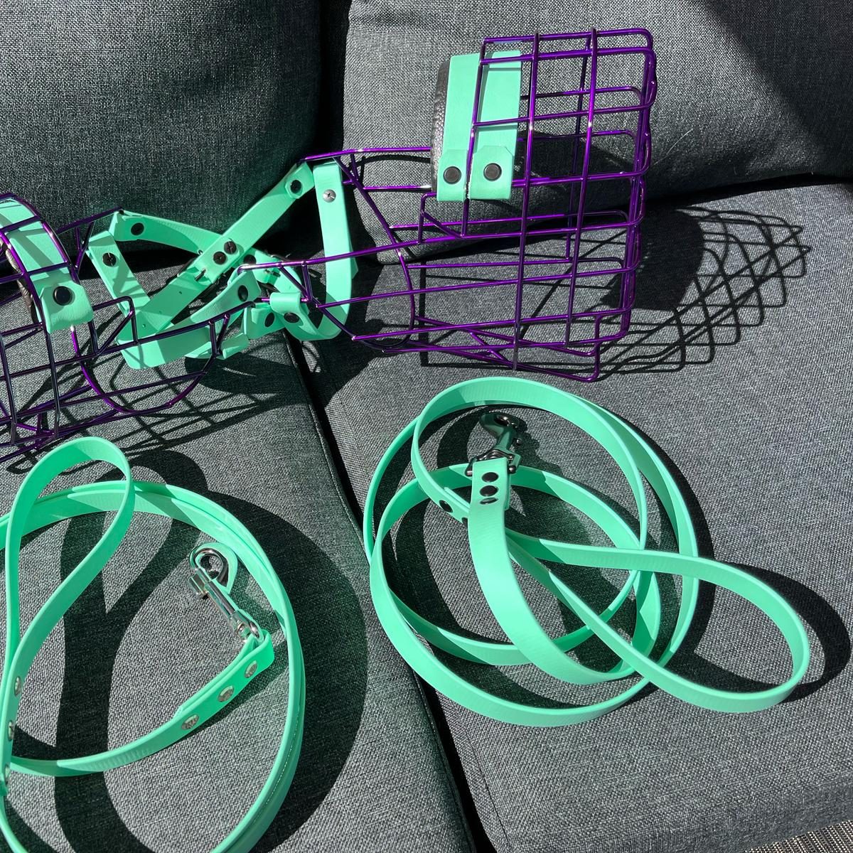 Hier gibt es einige Beispiele von Farben und Größen bereits angepasster Maulkörbe.